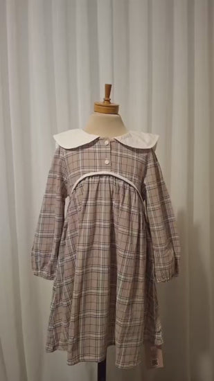 Este encantador vestido infantil captura la esencia de un estilo clásico y delicado, fusionando un patrón de cuadros en tonos suaves con un elegante cuello blanco que aporta un aire refinado y atemporal. Su caída ligera y el detalle fruncido en el pecho crean una silueta dulce y armoniosa, perfecta para realzar la ternura natural de cada pequeña.