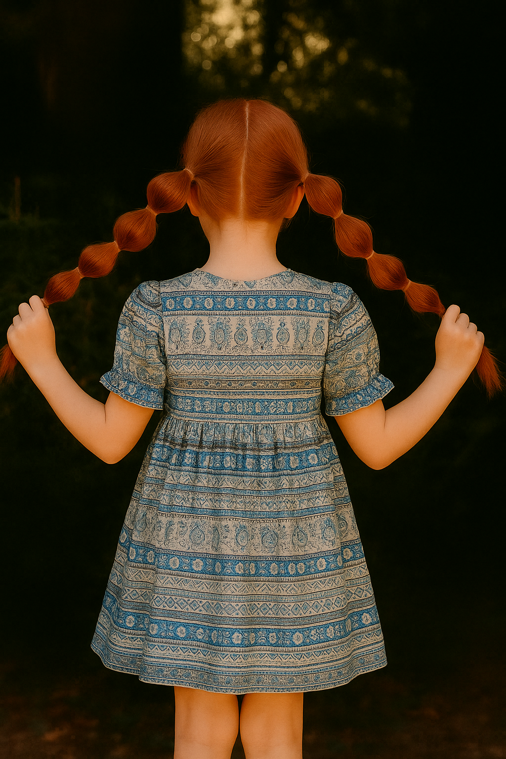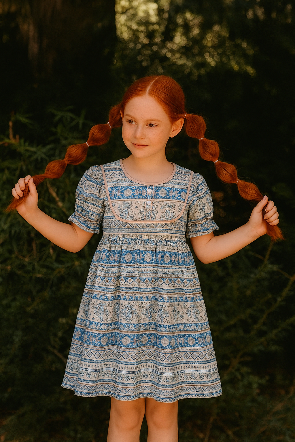 Mireya es un vestido de corte suelto, con estampado en tonos azules y detalles clásicos que evocan una infancia sencilla y elegante.